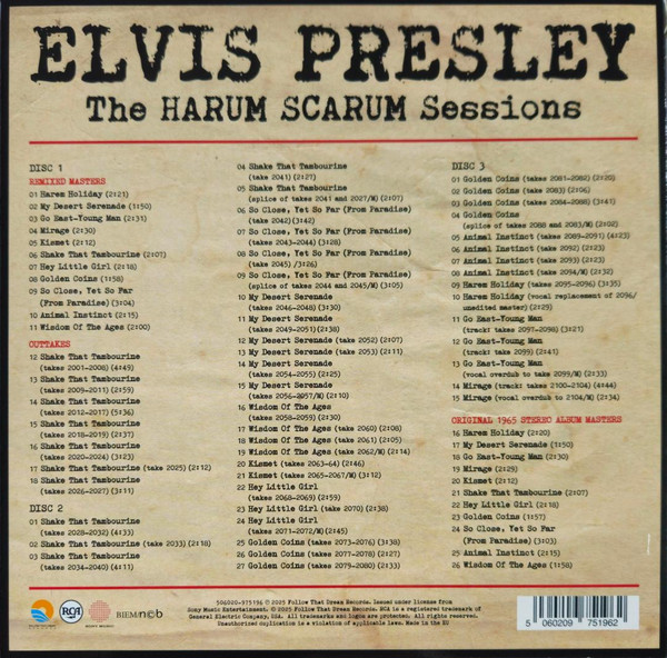 Como parte de sua bem-sucedida série de “sessões”, a FTD tem o prazer de anunciar o lançamento de “The Harum Scarum Sessions” – a edição comemorativa de 60 anos! Mixadas e masterizadas por Sebastian Jeansson e Vic Anesini, as masterizações e outtakes agora oferecem áudio muito superior ao álbum da trilha sonora original de 1965. Para os puristas, as masterizações originais também estão presentes no Disco 3.