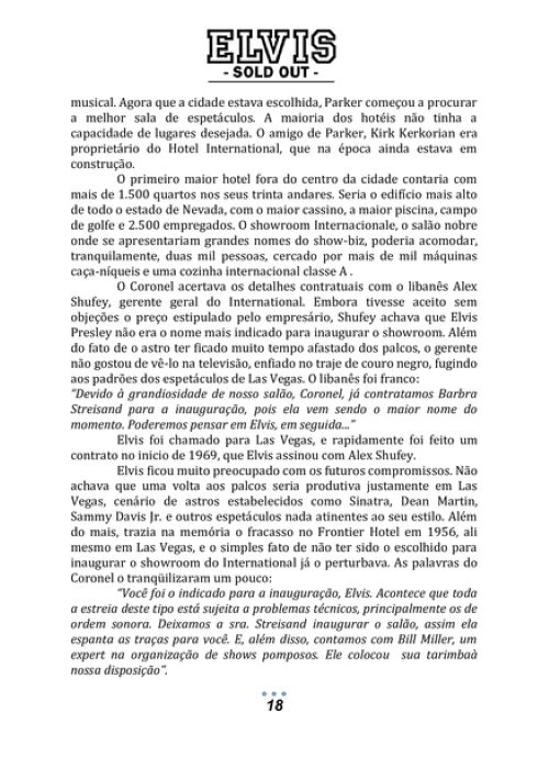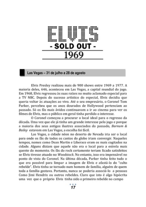 Elvis Sold Out – 1969 a 1977, traz em todos os detalhes, TODOS os shows realizados por Elvis entre 1969 a 1977. Em quase 700 páginas, você ficará sabendo onde Elvis fez seus shows, detalhes dos bastidores, hotel onde ficou hospedado, valor arrecadado em cada show, as canções que foram interpretadas, depoimento de fãs que assistiram aos shows e a reprodução de mais de 500 capas e conteúdo de CD´s que contém shows dessa época.