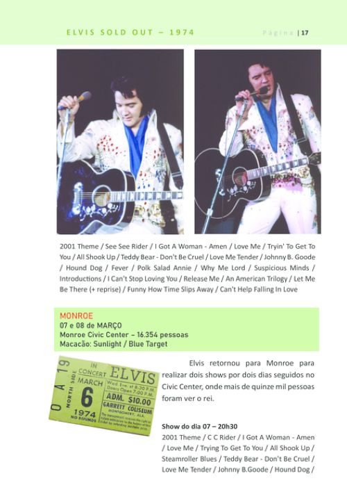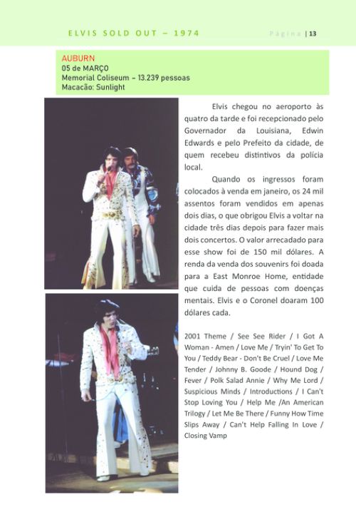 Em 1974, Elvis Presley fez 4 turnês, visitando várias cidades americanas. Todos os detalhes desses shows estão nesse livro: músicas cantadas em cada show, review dos jornais da época, mais de 100 fotos coloridas e reprodução de capas de CD´s que foram lançados contendo esses shows.